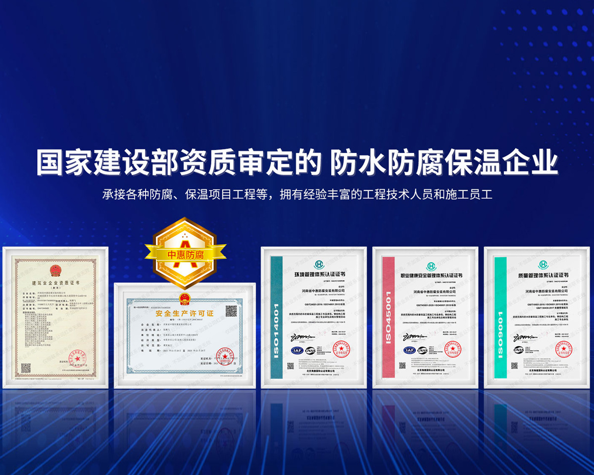 公司經營范圍:防水防腐保溫工程;消防設施工程;建筑裝修裝飾工程;建筑機電安裝工程;電力工程;建筑工程;石油化工工程;工業清洗工程;油罐清洗工程;鋼結構工程;環保工程;模板腳手架工程;電纜防火封堵、防污閃噴涂、外墻外保溫工程;各類施工勞務作業;設備維修、船舶鉚焊、涂裝;電力工程材料、建材、防水材料、防火材料、防腐保溫材料銷售,并相繼通過了GB/T19001-2008idtISO9001:2008GB/T50430-2007質量管理體系認證證書。GB/T24001-2004idtISO14001:2004環境管理體系認證證書。GB/T28001-2011idtOHSAS18001:2007職業健康安全管理體系認證證書。公司是中國防腐蝕于防護協會、中國施工企業管理協會、電力協會和中國鋼結構防水協會會員單位。 公司的經營業務涵蓋了石油、化工、電力、冶金、煤炭、船舶、國防、燃氣、水利、環保、交通運輸、航空及國防軍工和輕紡市政等行業的防腐保溫絕熱設備。鋼結構安裝、防火、防水、金屬噴鍍、聚脲噴繪、陰極保護、防滲透堵漏、玻璃鋼及各種磚版材料襯里、橡膠襯里、煙氣硫和耐酸溶劑腐蝕等工程施工。公司連續十年榮獲“省市先進施工企業”“安全生產先進單位”“重合同,守信用企業”和“AA***資質企業”的稱號。2000年被命名為市級文明單位,2002年被國家工商行政管理局命名為“重合同,守信用的企業”、被中國工業防腐蝕技術協會命名為“防腐蝕企業,能源節約及環境保護領域有豐富的經驗和***的業績。工程一次交驗合格率100%。其中攀枝花鋼鐵公司煉鐵廠四號高爐及熱風爐防腐工程、上海寶鋼公司煤氣柜防腐工程、撫順石油一廠裝置防腐項目、齊魯石化公司稀烴廠高塔防腐工程、吉林化學工業公司煉油廠油罐防腐工程、天津石化熱電廠六號爐頂棚聯絡管保溫工程、大慶油田(太倉)力神泵業工程、中國化學工程第十一建設工程、中原油田勘探局工程、中國石化銷售有限公司華北分部、魯皖輸油管道工程、貴州開磷息烽合成氨工程、陜西黃陵煤化工程、中國石油天然氣西部管道塔里木輸油工程、邯鋼集團邯寶鋼鐵公司煉鐵工程、德州供電工程、吉寶(南通)船廠工程,偃師華潤熱力工程、鄭州熱力總公司。 河南省中惠防腐安裝有限公司愿以豐富的施工經驗,***的技術,***的設備,***的管理,***的服務,竭誠為國內外廣大的用戶提供***滿意、******的工程作品。 我公司愿與國內外同仁一道,團結協作,共同推進防腐蝕行業發展! 公司地址:河南省長垣縣建設路北段360號 固定電話:0373-8866488 郵編:453400 網址:http://www_zhff_com_cn.letingwancheng.com